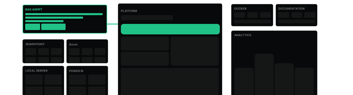 Adapters for SharePoint, Azure DB, Power BI, and file shares unify schemas and entities.